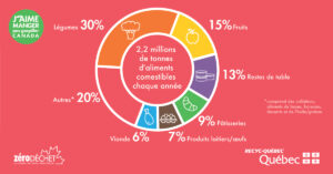 Chacun de nous s’est déjà retrouvé dans une situation de gaspillage alimentaire. Un Québécois jette en moyenne 41% de sa nourriture, pour un total de 3,1 millions de tonnes selon Recyc-Québec. Le gaspillage alimentaire représente l’alimentation qui est perdue, jeter à n’importe quelle étape du système bioalimentaire. Parmi les aliments les plus jetés, 45% sont des fruits et légumes, une famille gaspille en moyenne 140 kg/an ce qui équivaut à 1300$. Le gaspillage d’aliments comestibles n’empêche pas l’émission de gaz à effet de serre (GES), 1,2 million de tonnes d’aliments génèrent 3,6 millions de tonnes de GES. La viande et la volaille sont les denrées les plus émettrices de GES , 13% de viandes gaspillées équivalent à 59% des CO2eq.