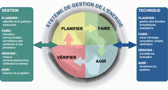 L’ISO 50001 repose sur le modèle d’amélioration continue basée sur quatre étapes « planifier, faire, vérifier, agir » (PFVA) :